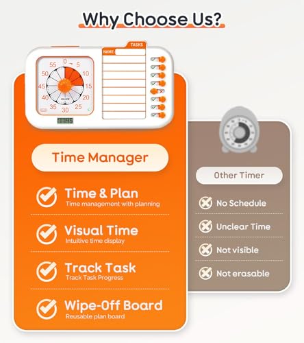 [3-in-1 Time Management Tool]: This 60-minute timer with a dry erase planning board combines a digital timer, visual timer, and to-do list to track chores, homework, and daily routines. It boosts productivity, builds time awareness, and helps stay on schedule—ideal for improving focus and time management
