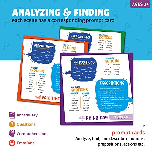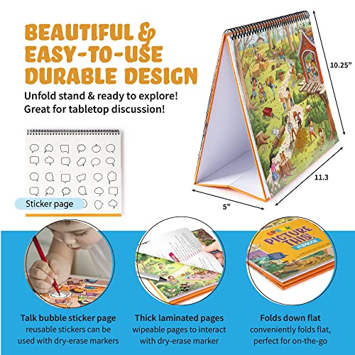 Strong and Durable: Elevate your storytelling time with the laminated storytelling and BONUS Pull-Out Prompt Cards with Reusable Bubble Stickers. Get creative, highlight details with a dry erase maker
