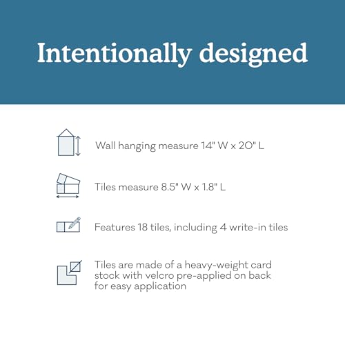 PRODUCT SPECS: Our visual schedule includes a canvas wall hanging (14″W x 20″L) and 18 single sided card stock tiles. Each tile features a velcro back so it can be moved easily. Tiles feature an image and name of each task so it can be used by both readers and non-readers. We’ve also provided blank tiles so you can create your own tasks.