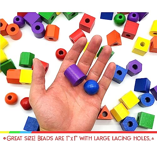 PREMIUM LACING BEAD SET: Includes 120 durable wood beads (1 inch diameter) in 6 fun colors and 5 distinct shapes, with 4 plastic-tipped laces (36 inches each) and a convenient storage container. Share the fun at home, in preschool, or while on the go – there’s plenty to go around!