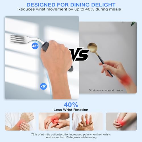 [Recommended by Occupational Therapists] 45° Angled Design for Wrist Comfort: For people with arthritis or Parkinson’s, bending over 15° can exacerbate pain in 78% of arthritis patients. Our unique 45° – designed adaptive utensils can naturally guide food to the mouth, reducing wrist movement by up to 40% during meals, with wrist bending less than 5°. This greatly alleviates wrist strain.