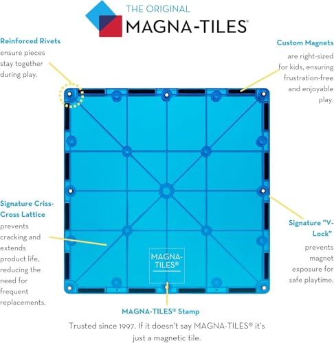Safety Guaranteed: All MAGNA-TILES pieces are built to withstand countless hours of playtime. Our signature lattice prevents cracking, while fastening rivets keep magnets safe and secure.