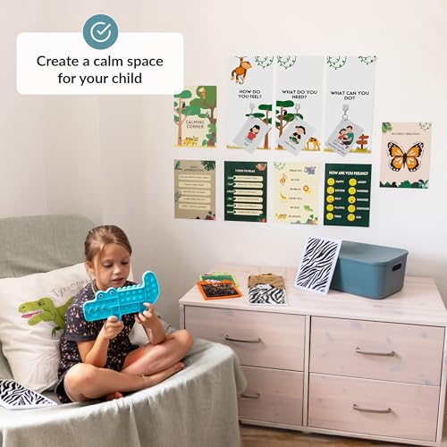 ODOXIA Calm Down Corner | Classroom and Special Education Must Haves | Therapy Calming Corner Items for Kids | Safari Themed Calming Corner Kit with Plush, Posters, Solutions Wall