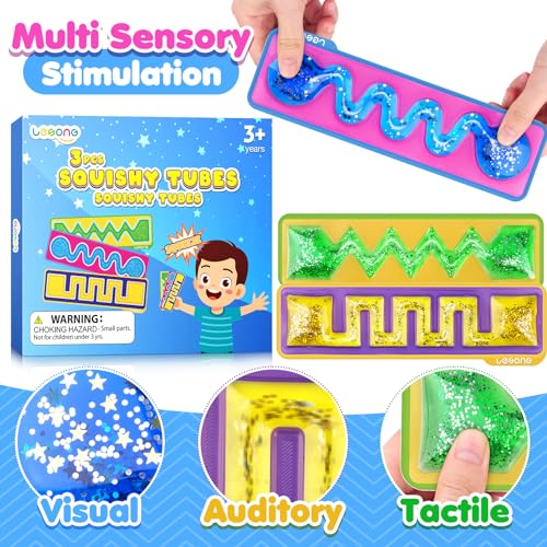 Fun Sensory Toys: LESONG squishy sensory toys are designed with three vibrant colors and maze-like paths to captivate the attention of kids and toddlers; The mesmerizing flow of glitter and glass balls through the sensory tubes, along with the soft touch of colorful goo, offers a rich sensory experience that’s endlessly fun and keeps LESONG by your side