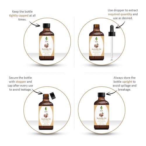 PREMIUM QUALITY NUTMEG ESSENTIAL OIL: SVA Nutmeg Oil 4oz is an essential oil and is obtained by steam distillation extraction of Myristica fragrans seeds. Our Nutmeg oil is free of preservatives and comes with a dropper for easy application. It is not tested on Animals. We care for you!